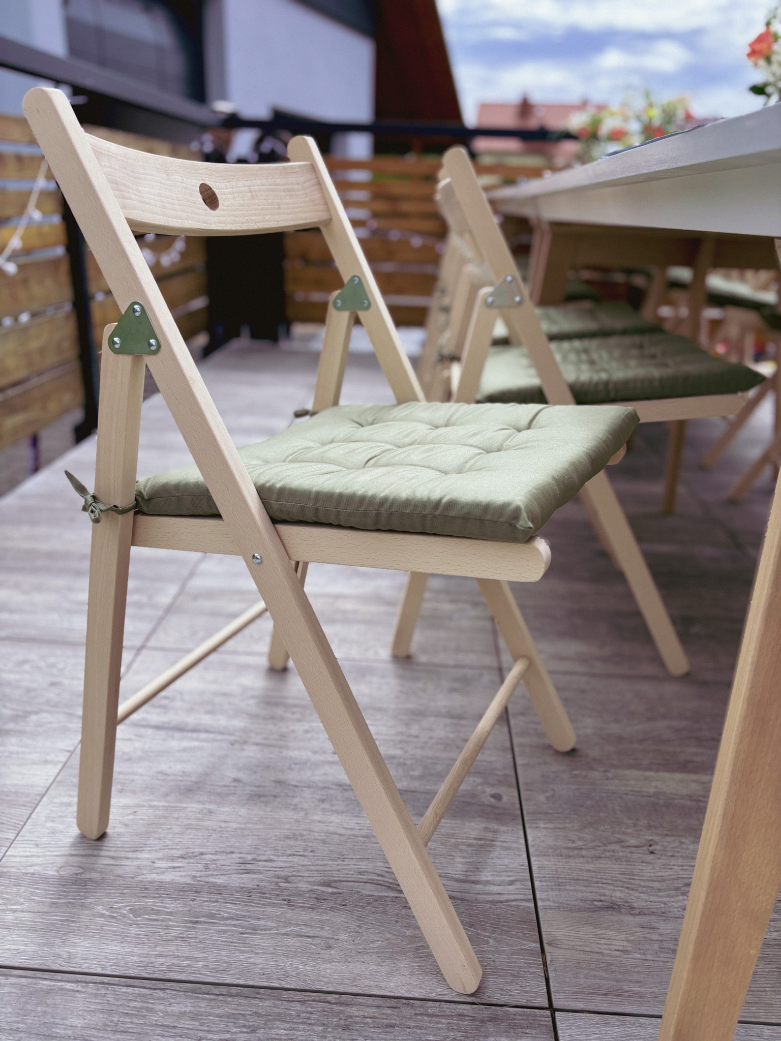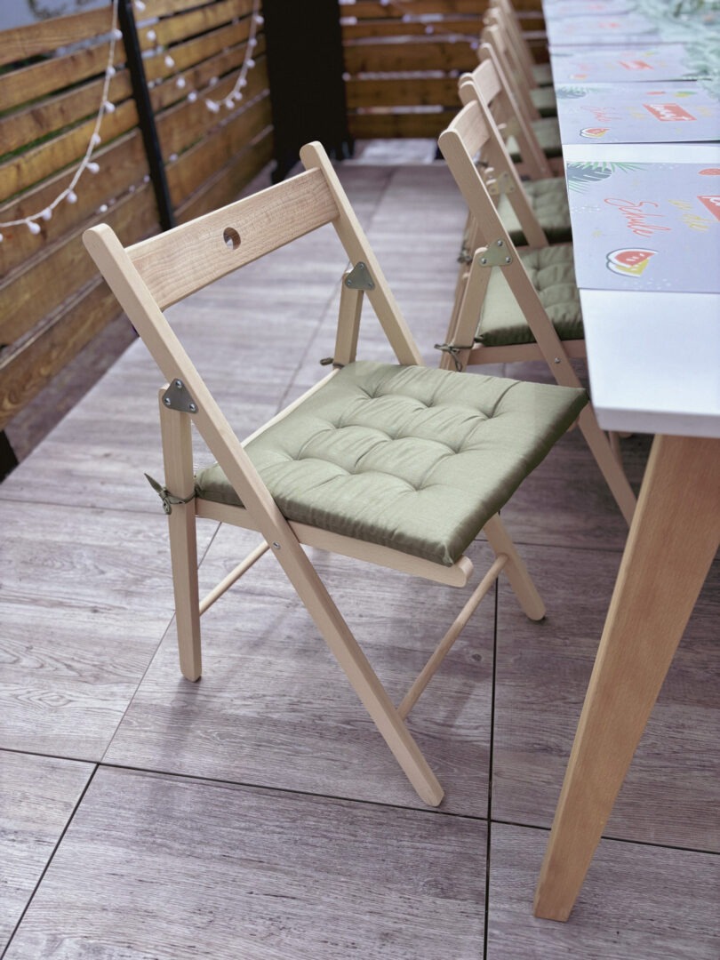 Kombiniert mit unseren Klappstühlen aus naturbelassenem Buchenholz entsteht ein harmonisches Gesamtbild. Wer es noch bequemer mag, ergänzt die Stühle mit unseren weichen Sitzkissen.